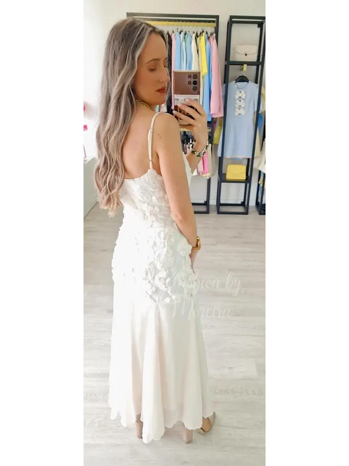 Este vestido destaca-se pelos delicados detalhes em flores 3D, que acrescentam um toque romântico e sofisticado ao visual. Ideal para ocasiões especiais, combina elegância com conforto, proporcionando um look feminino e encantador.