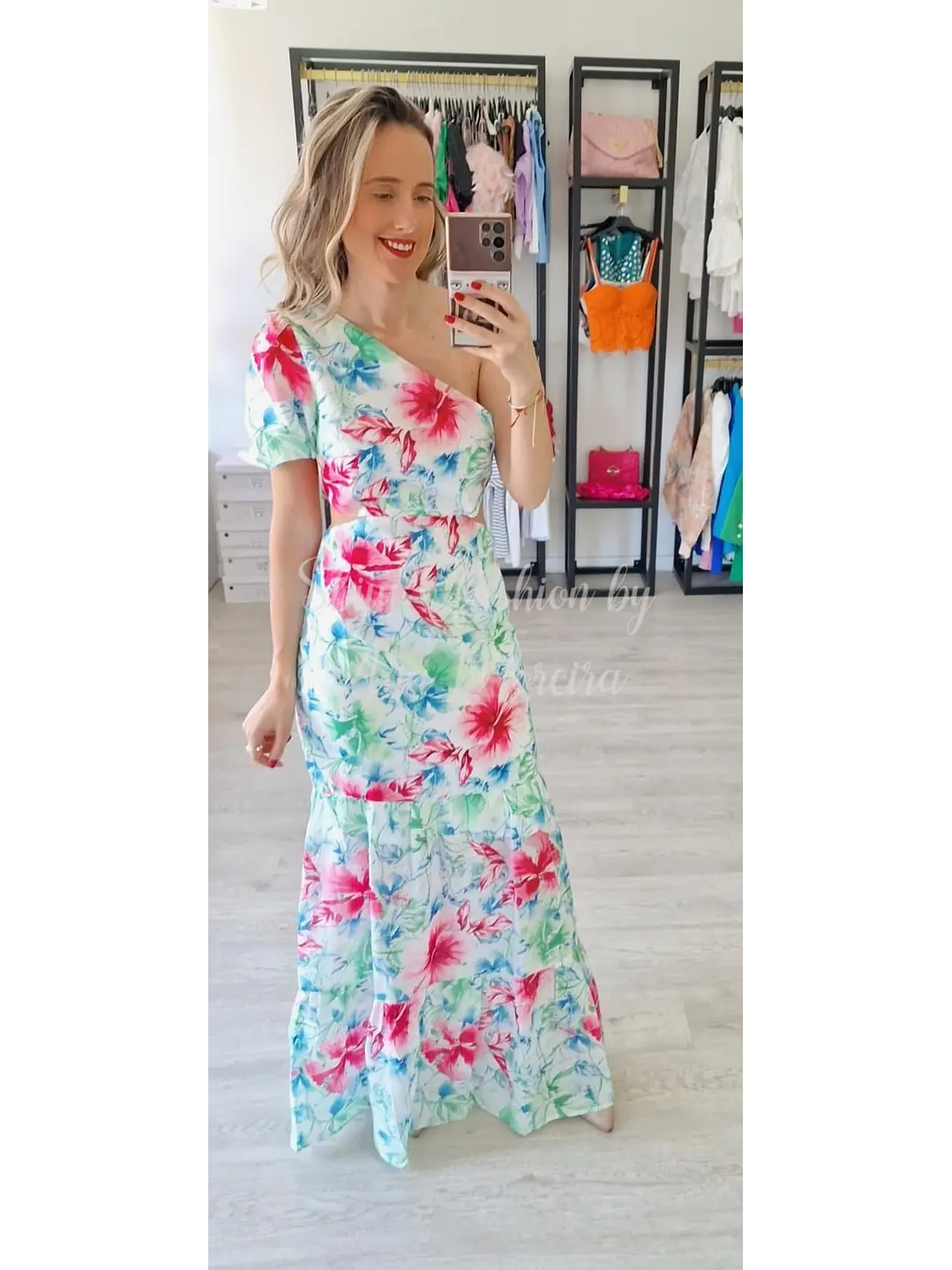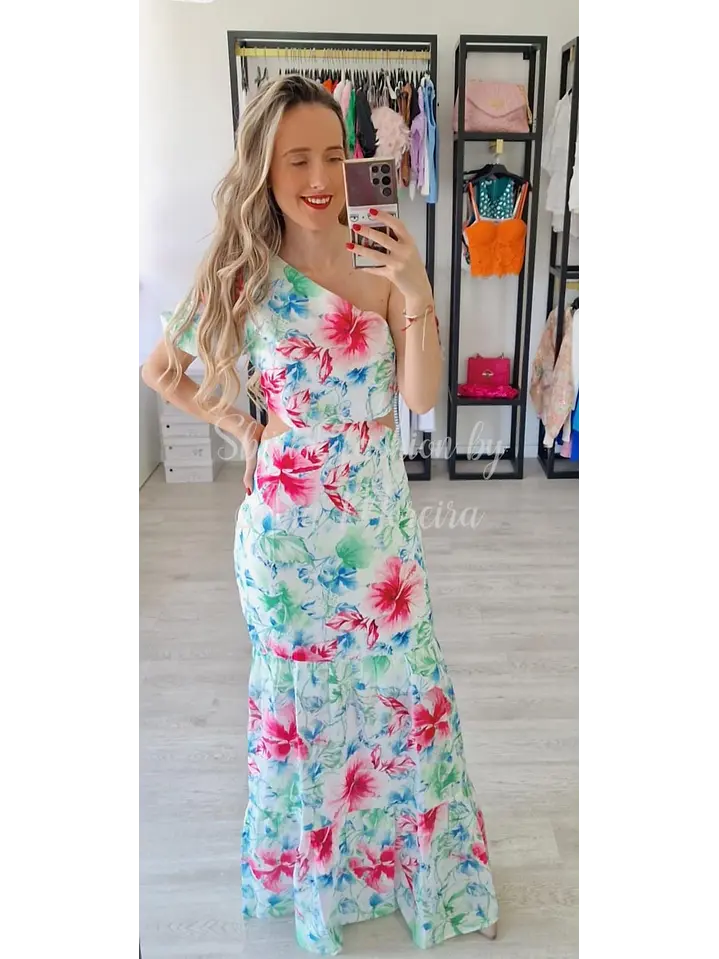 Com abertura nas costas e forrado, este vestido combina elegância e modernidade, destacando-se pelo seu padrão floral e o detalhe de uma manga única. Ideal para ocasiões especiais ou para um look sofisticado no dia a dia.