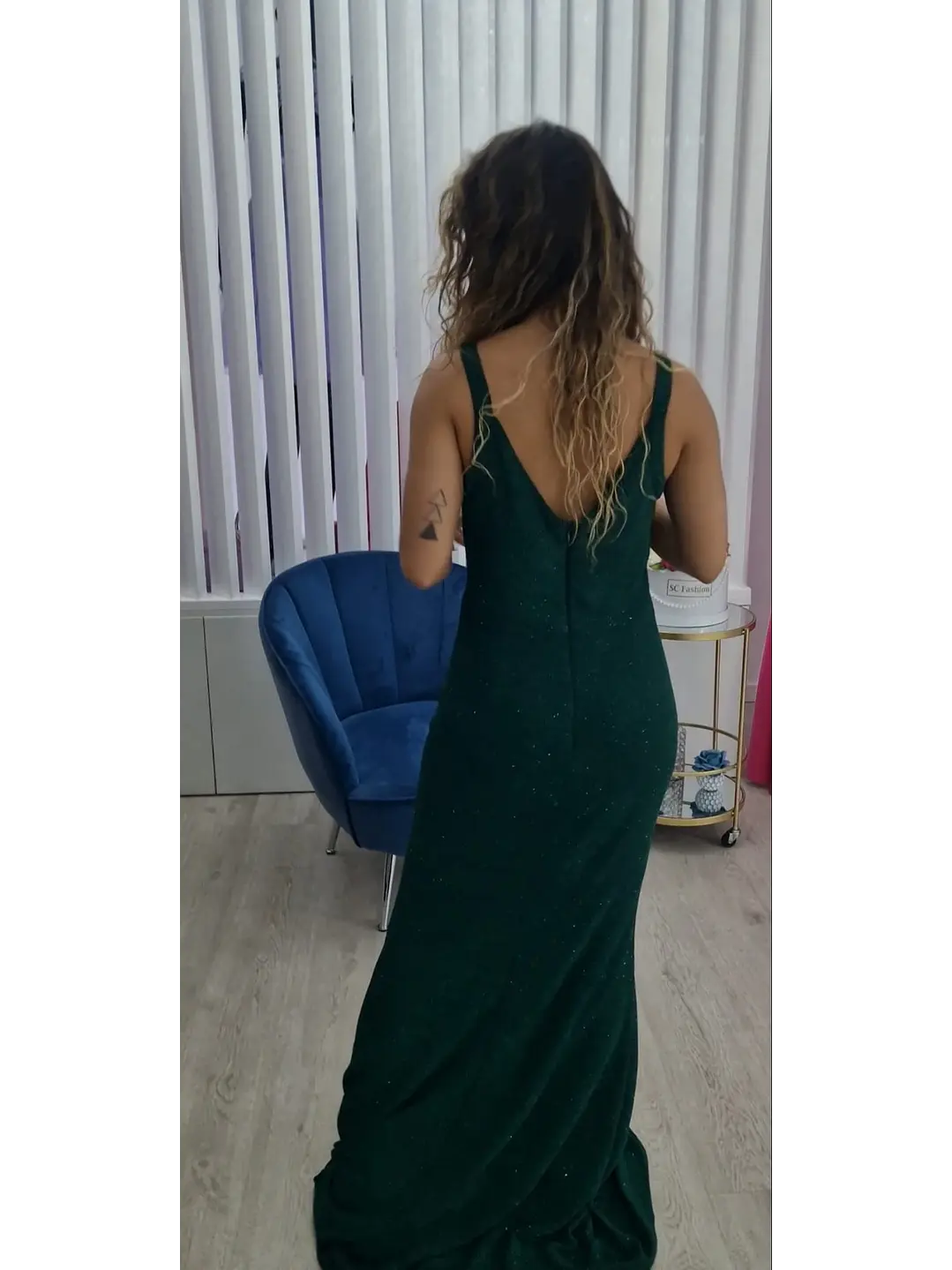 Vestido deslumbrante, todo em brilho, ideal para ocasiões especiais. O elegante decote e a racha dão um toque sofisticado e sensual. O fecho nas costas garante um ajuste perfeito, proporcionando conforto e estilo ao longo de toda a sua utilização.