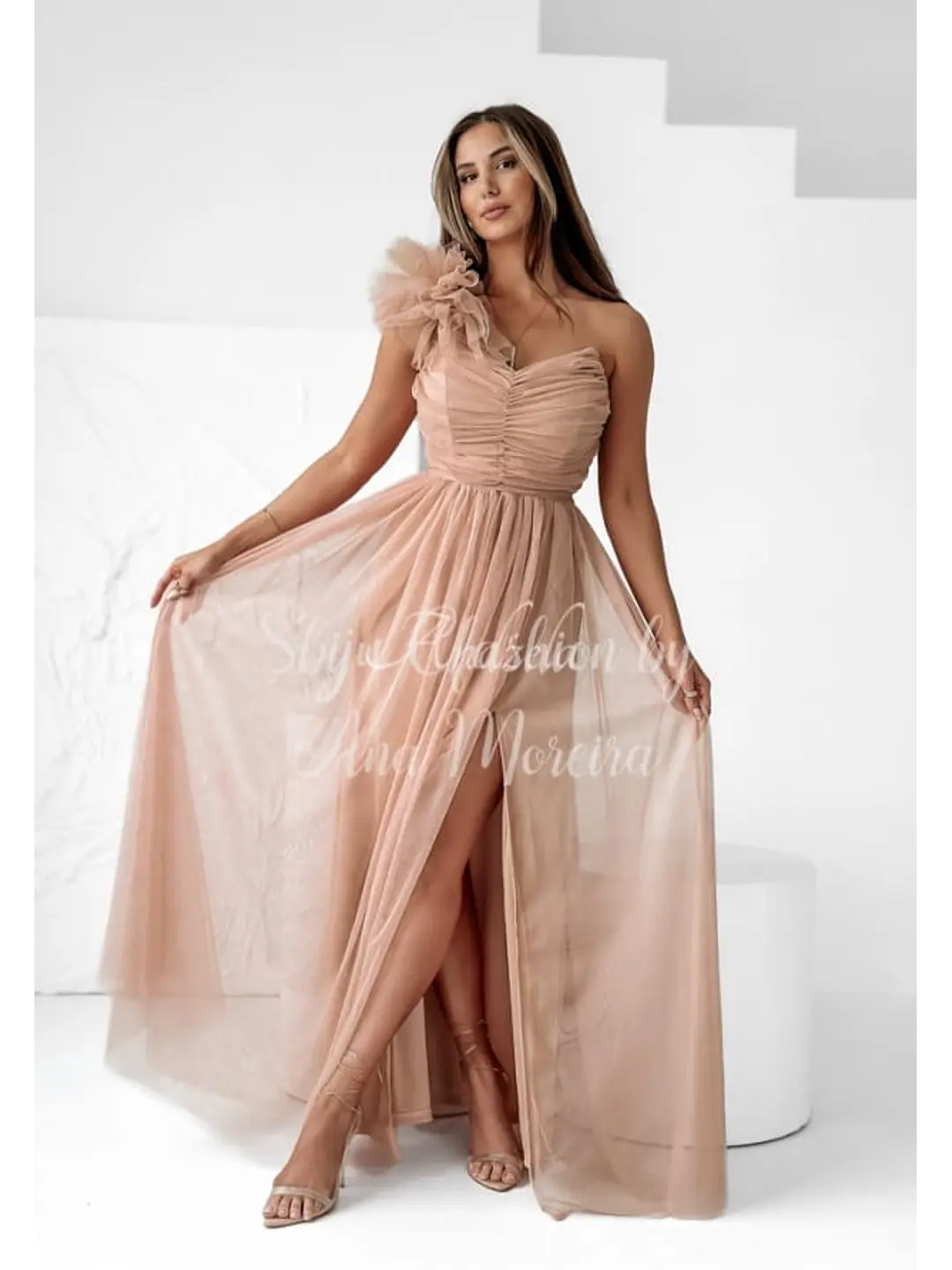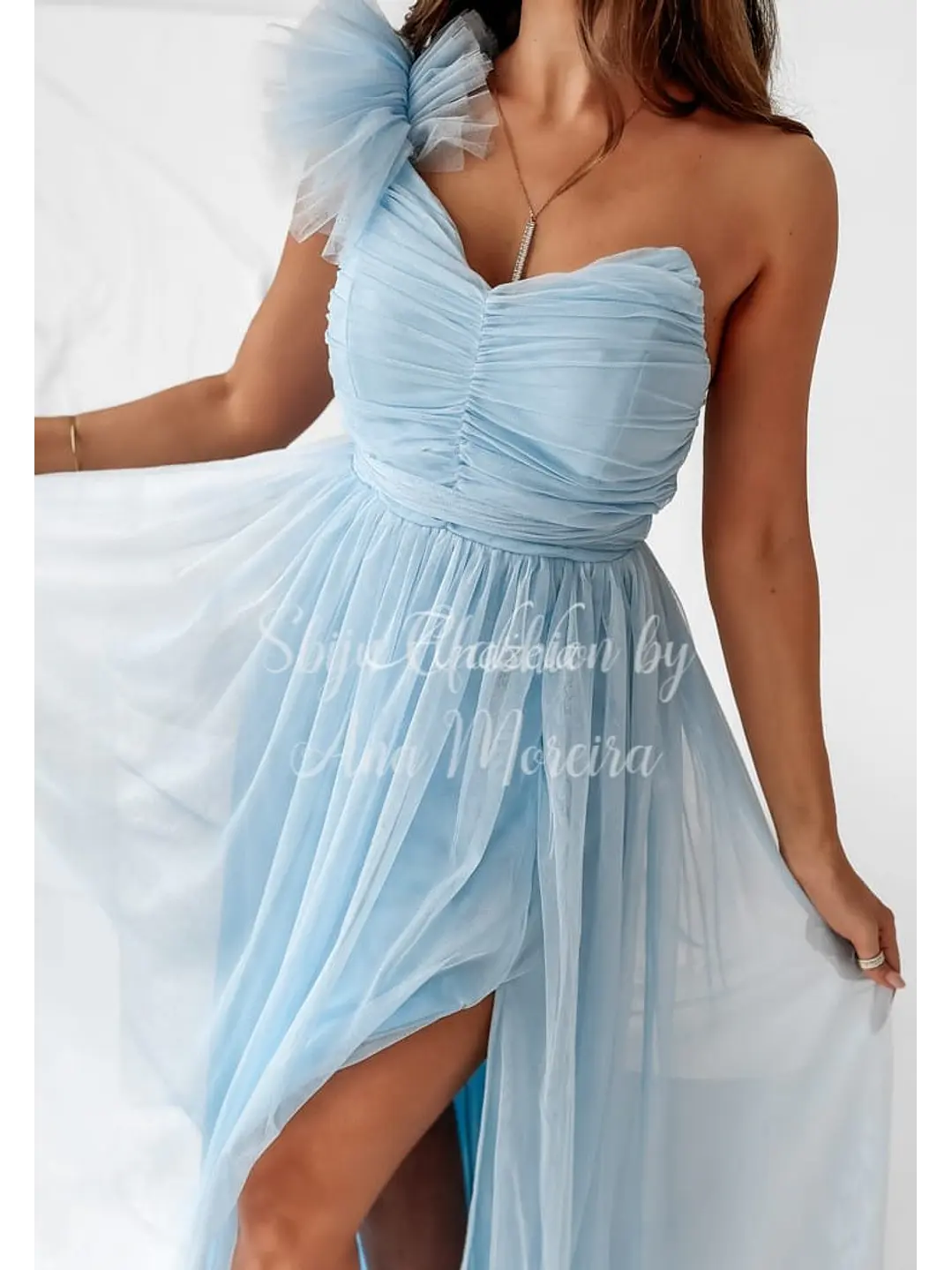 Vestido em tule leve, fluido e elegante. Uma alça com folho no ombro, dando um toque especial. Racha lateral discreta. Com copa para suporte e conforto.